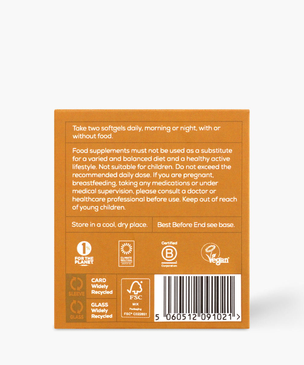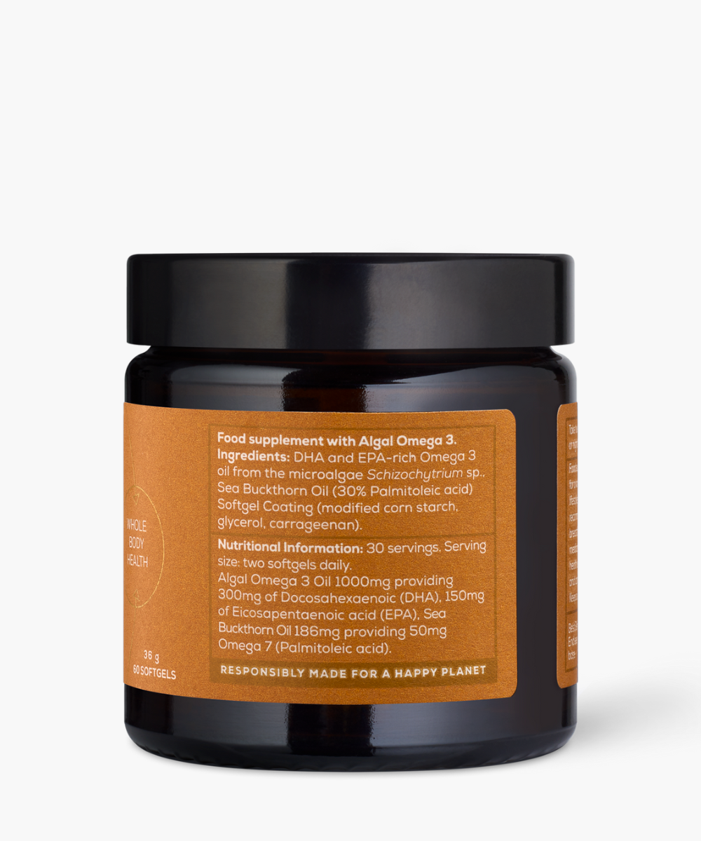 Combining algae-derived Omega 3 with Omega 7 from sea buckthorn, this advanced formula delivers essential fatty acids that modern diets often lack. Rich in EPA and DHA, Omega 3 supports heart health, brain function and healthy vision, while Omega 7 works at a cellular level to help maintain skin hydration and integrity. Together, they help protect the delicate membranes that surround every cell, supporting balance and resilience throughout the body.